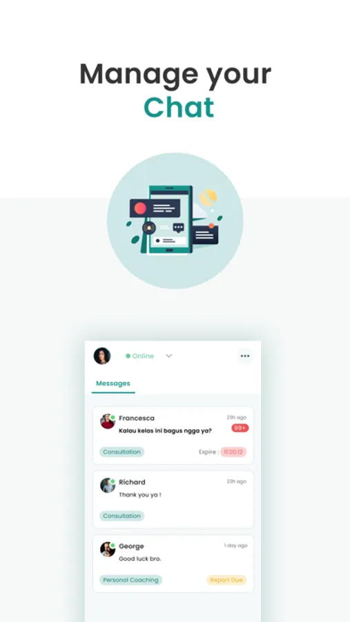 Manage your online and offline status for chat. User can contact you if you for a consultation if you set your status online
