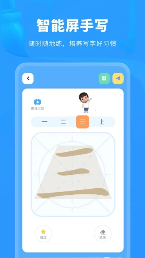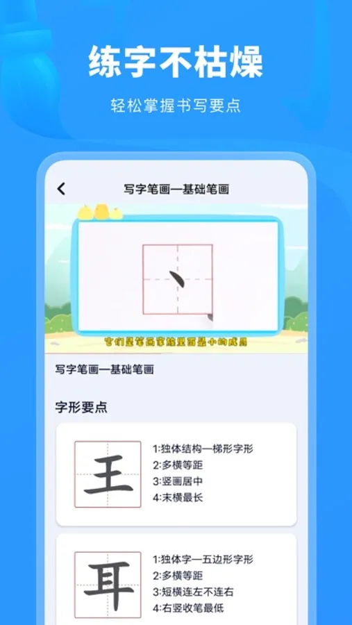 1、书写示范:根据每一个字不同的形态、结构特征,刨析书写要点+专业书写示范,强化用户对字结构的理解,提升练字效果。