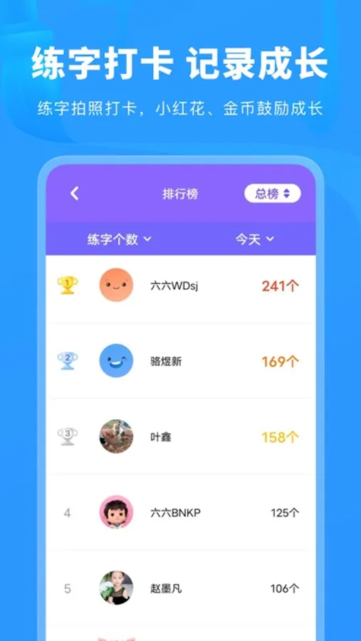 4、练字打卡:解决线上独自一人练字的窘境,突出用户间的良性竞争,使用户处于良好的练字状态,增强练字效果。