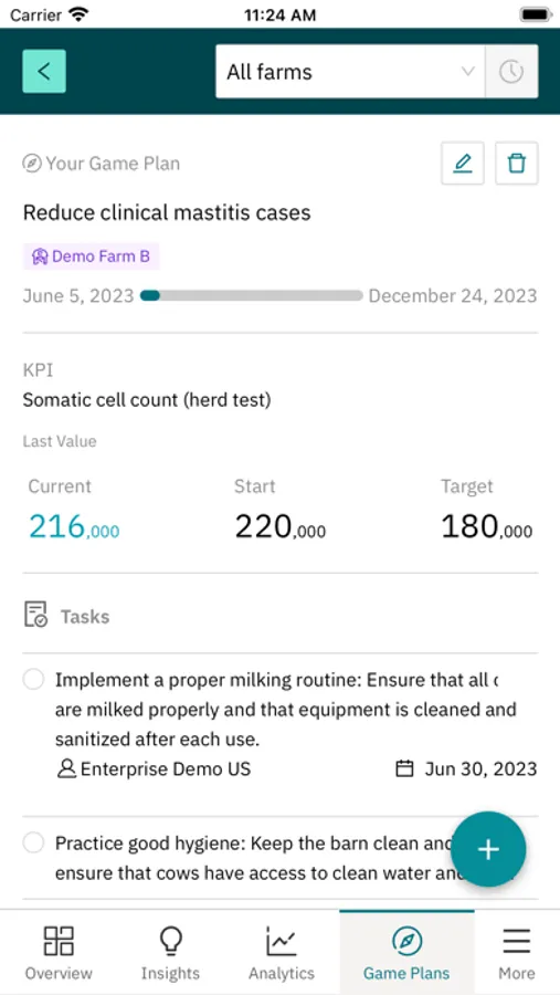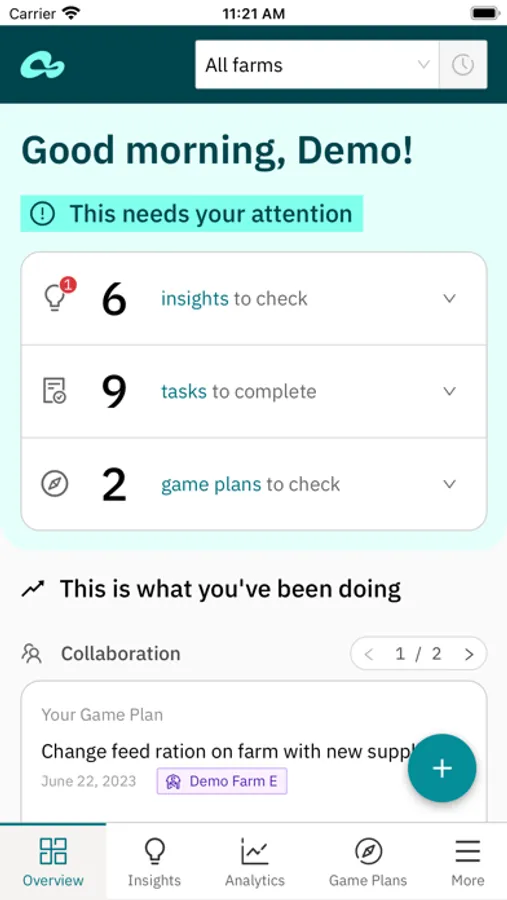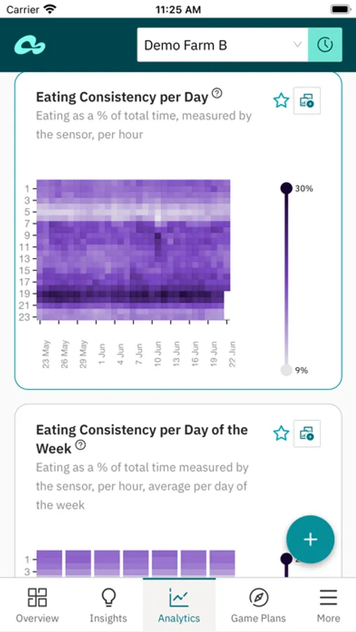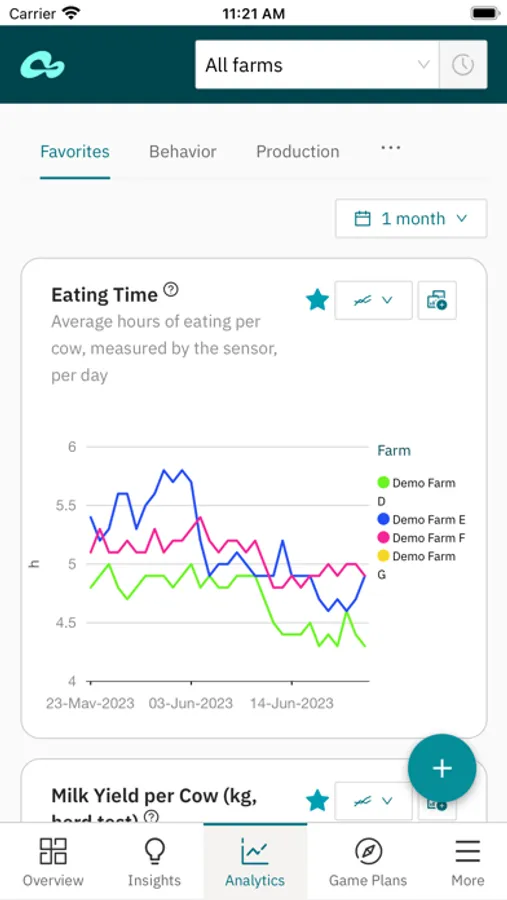 - Analytics – analyze and compare farm KPIs to identify trends and opportunities for improvement. Available dashboards: Behavior, Reproduction, Production, Feed, Health, Herd Composition, Weather, App Usage;