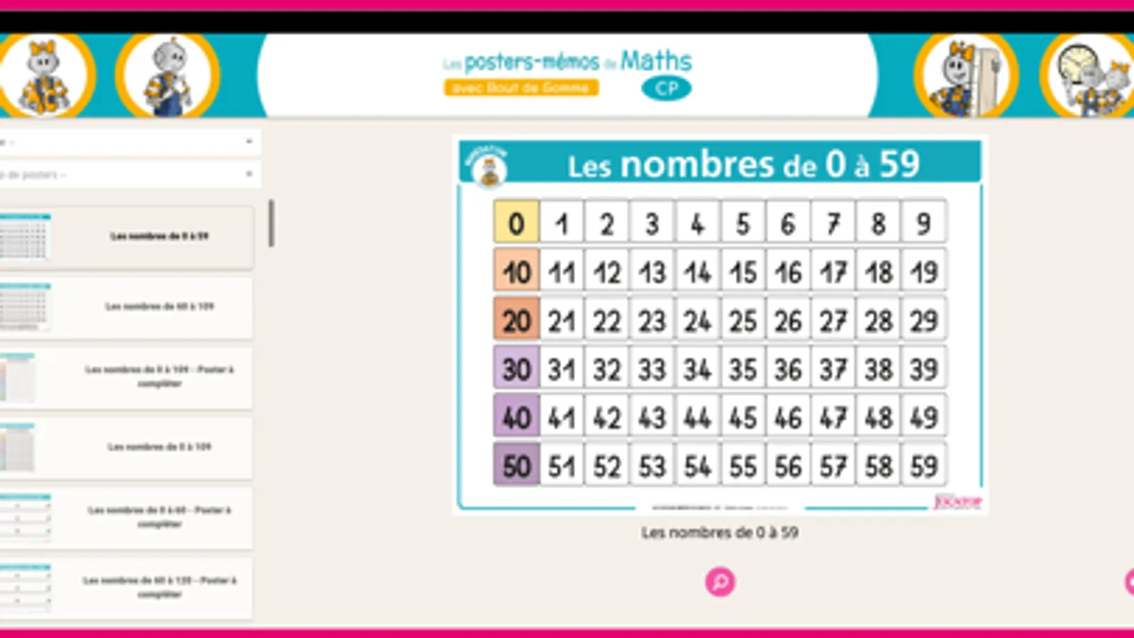 Les indispensables du programme de mathématiques de CP sont abordés à travers 40 posters papier, animés par les personnages de Bout de Gomme, Tirobot et Robotine. Trois types de posters sont proposés :