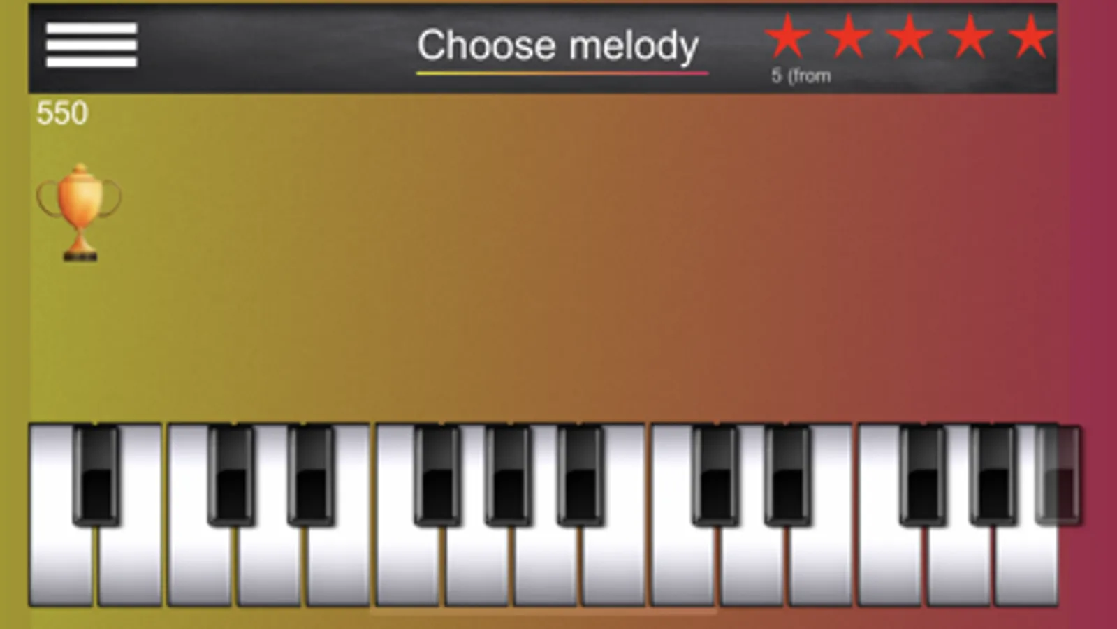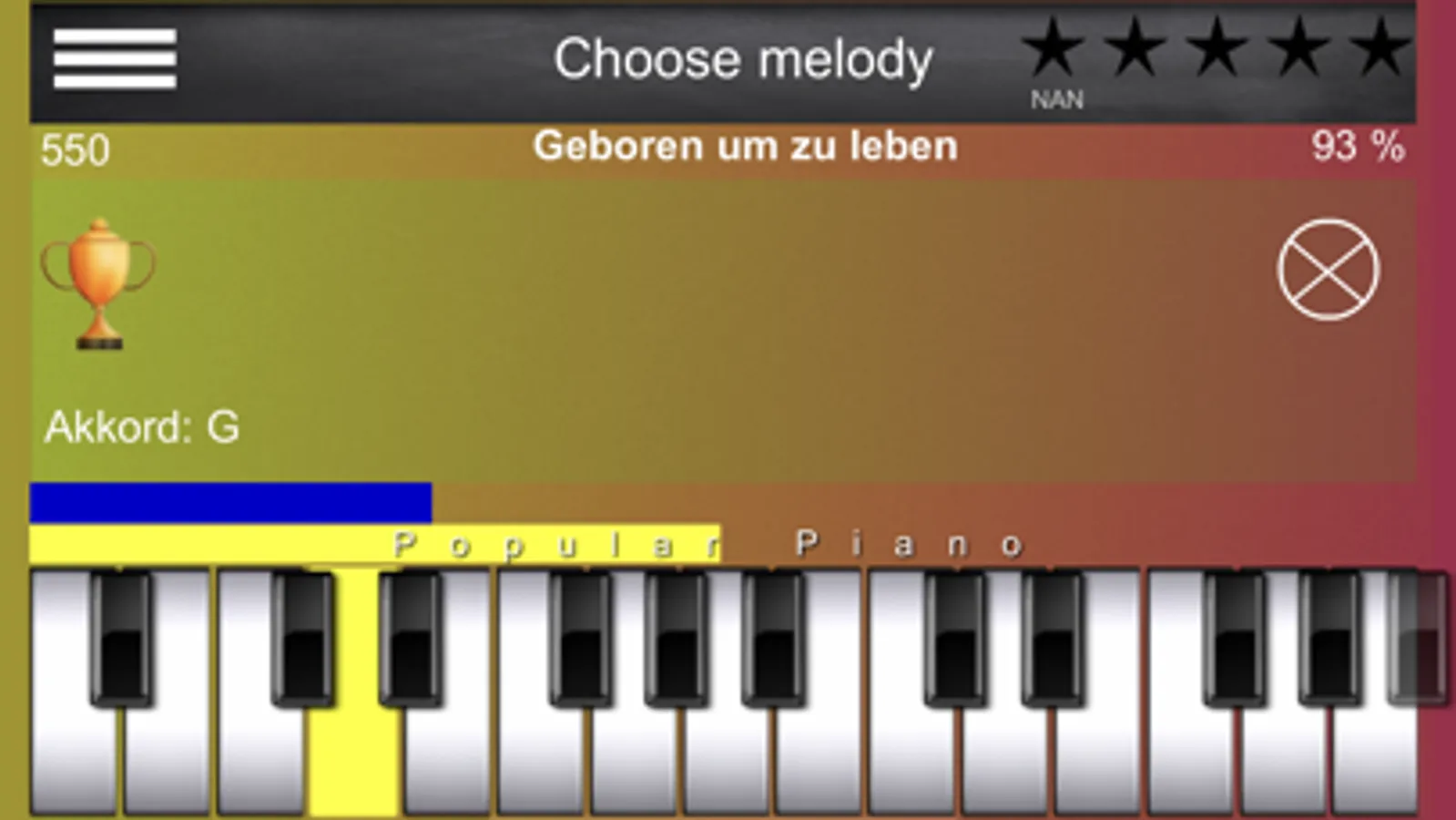 In play mode the right keys on the keyboard are highlighted throughout the Chorus melody until you press/tap on them. Points are awarded for each accurate keypress so that you can see your score at the end of the melody. What is more, you can see your current position in the top list of all players worldwide.