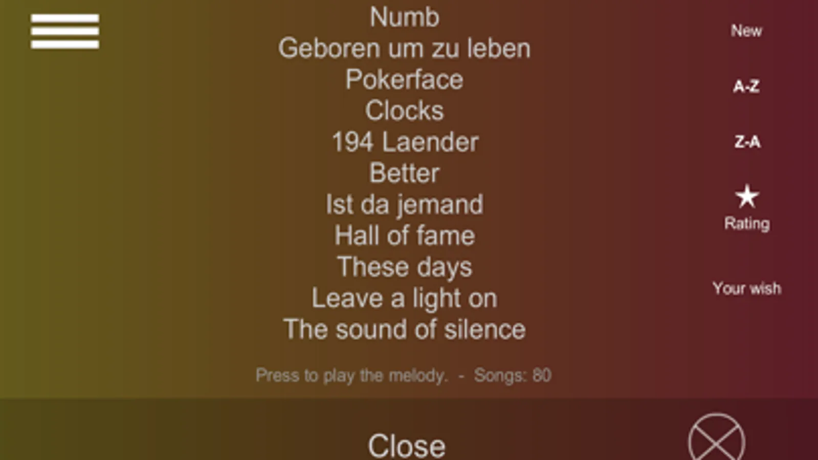 The Melody App gives you the possibility to easily learn to play the chorus of the newest hits on the piano. The list of available songs is expanded continuously - without any additional costs per song and completely ad-free! This way you can learn a whole repertory of hits on the piano and impress your friends.