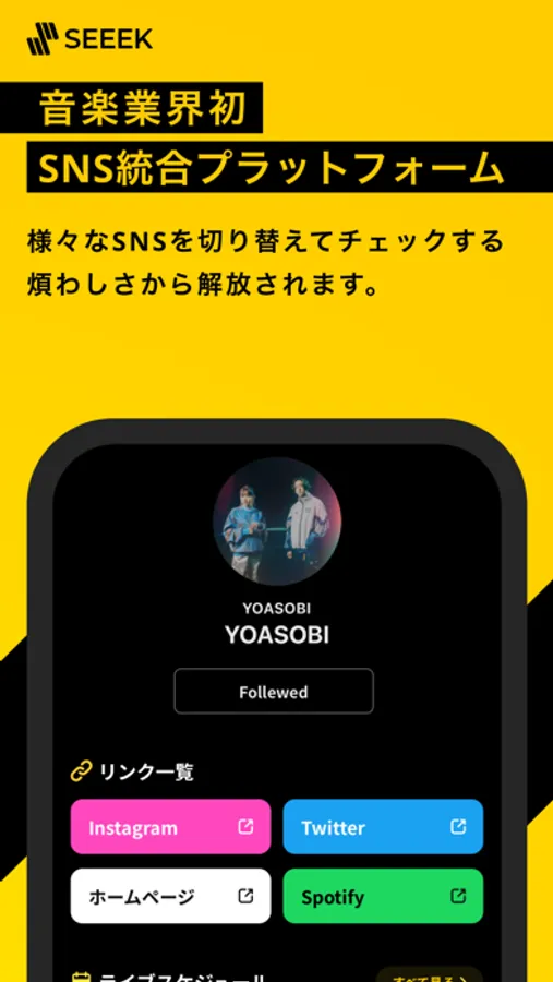 SEEEK内のボタンでアーティストのSNSやホームページに直接移動できます。手間のかかる検索は不要です。