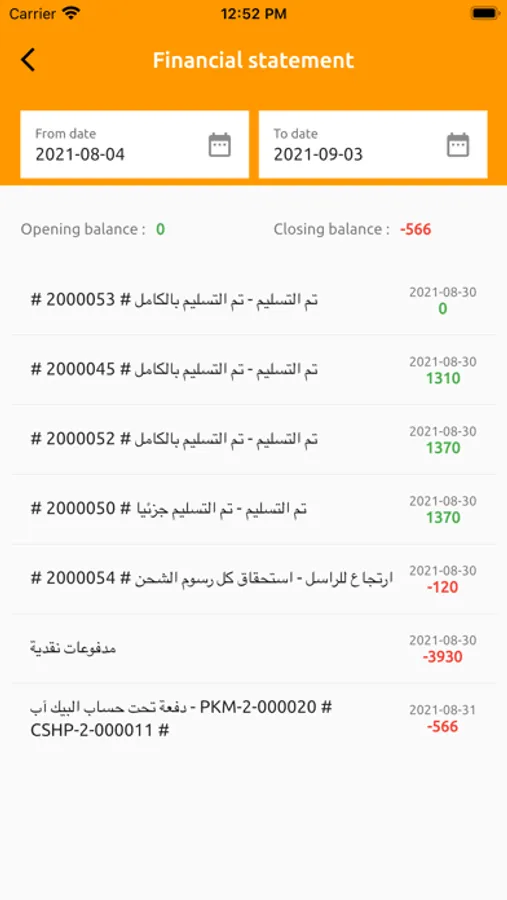 • كشف حساب العميل به تفاصيل المعاملات المالية