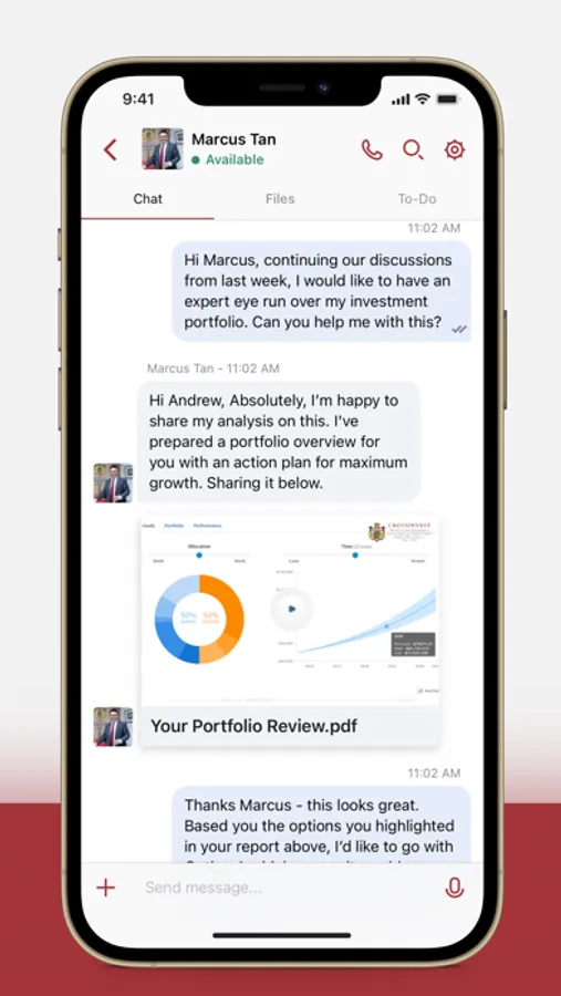 Cross Connect enables private communication with dedicated advisors and support team members on a secure platform. Collaboration capabilities include text, voice, and video messaging, video conferencing, digital signature, live document annotation, file sharing, transaction management, and more — delivering an unparalleled wealth management experience.