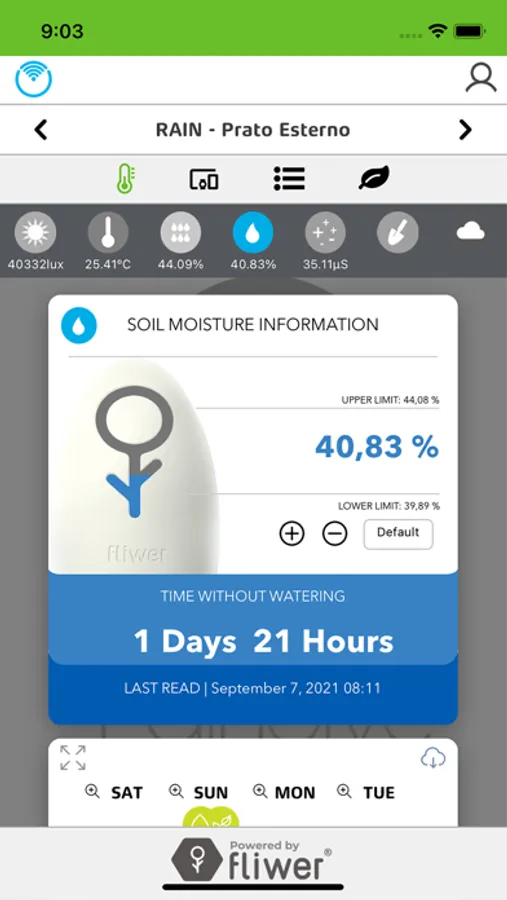 Without requiring any hourly or temporary programming, Rainolve will alert when the volumetric water content of the crop is below the appropriate threshold and, if you confirm, activate watering and return to optimum soil moisture for your plants. Therefore Rainolve doesn’t act on the plant through hourly and intuitive programming but knowingly, so acts always intelligently with user confirmation. User can also modify default thresholds of the different parameters to adapt specifically to the conditions of cultivation.