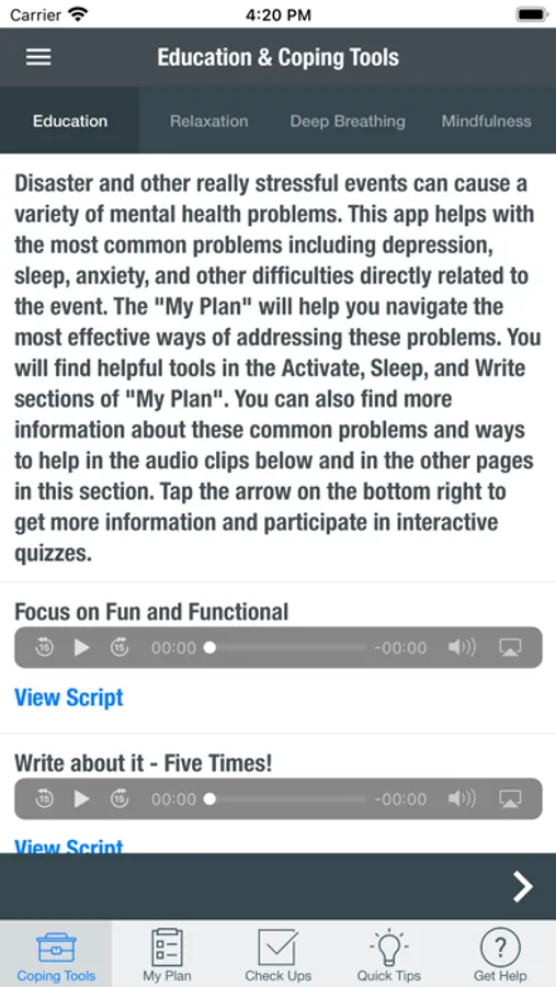 - Effective coping tools that include relaxation skills, mindfulness, scheduling pleasurable activities, monitoring and improving sleep, writing about your experience, and tools to manage stress and anxiety.