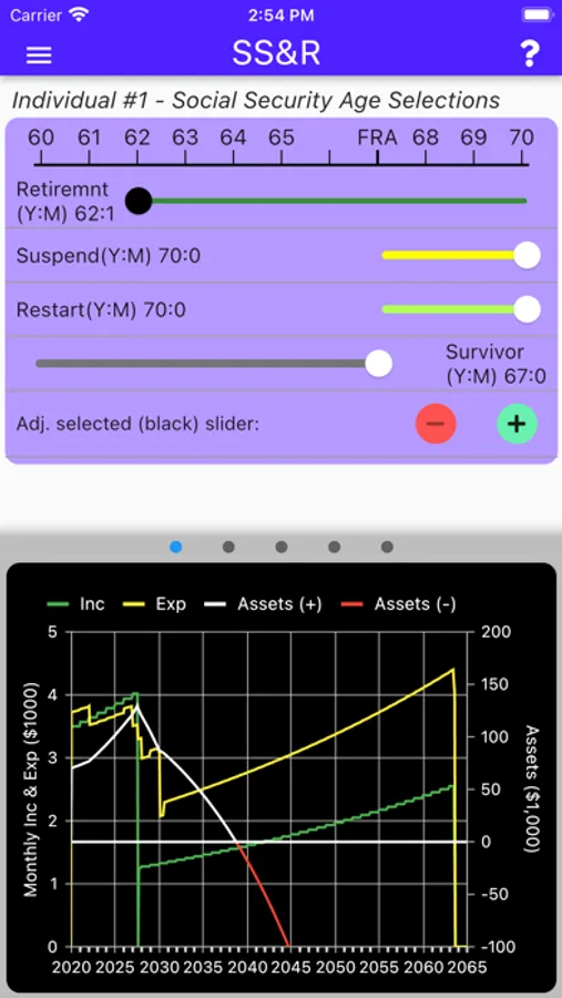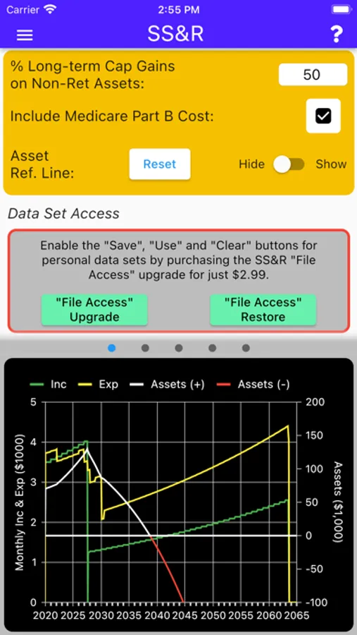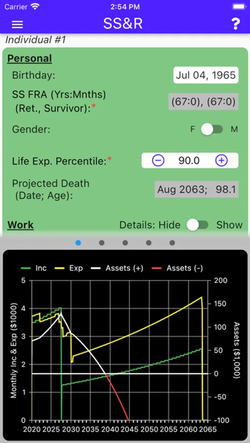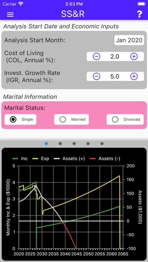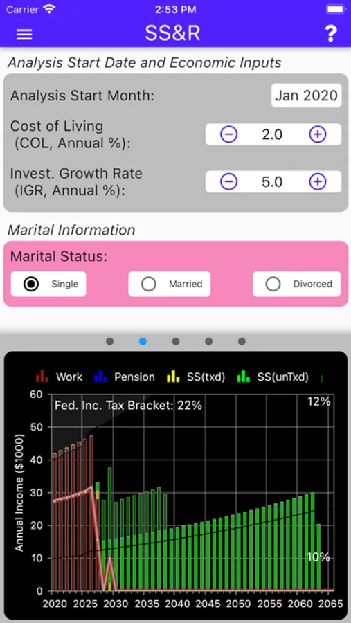 The user may also specify the values for Cost-Of-Living and Investment Growth Rate. SS&R, utilizing the key rules of both Social Security and the IRS, then does its work to create estimates of your financial future.