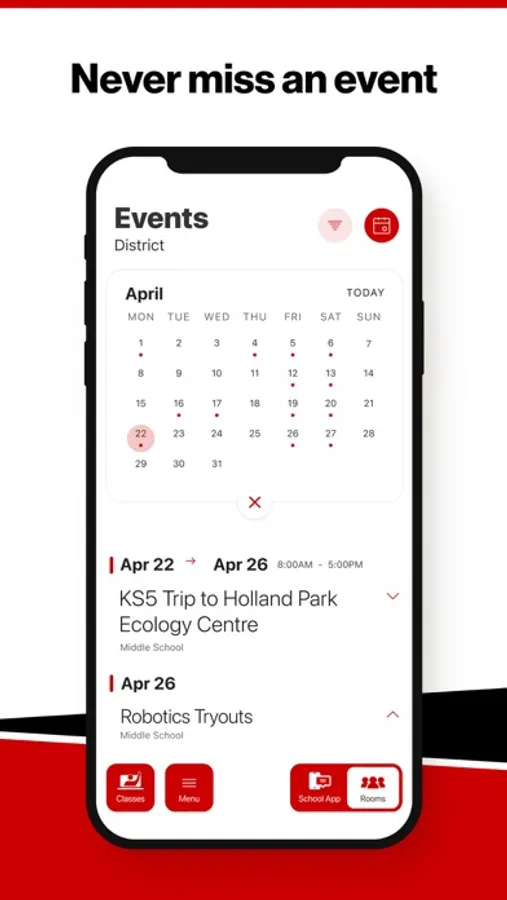 The event section shows a list of events throughout the district. Users can add an event to your calendar to share the event with friends and family with one tap.
