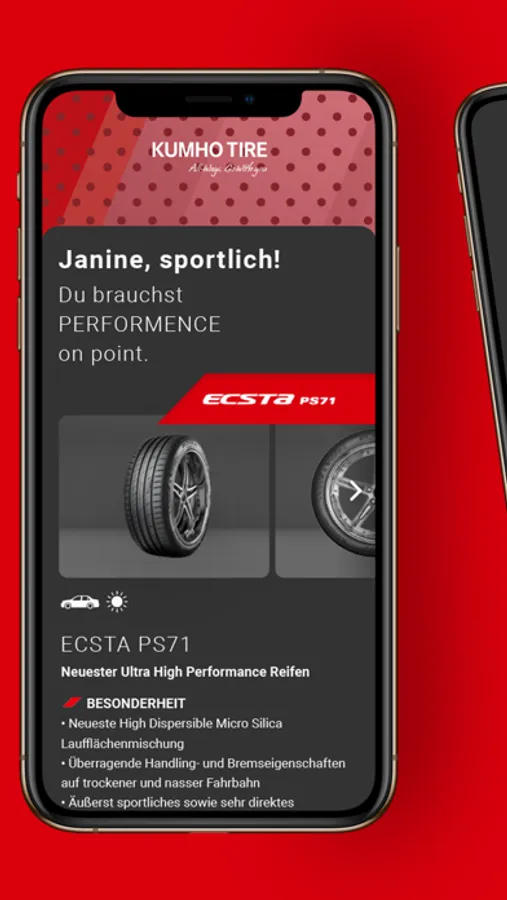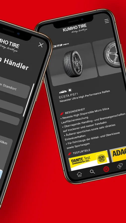 The Kumho App is the free mobile tyre app for the German market of the South Korean tyre manufacturer KUMHO TYRE. The app offers easy and quick access for dealers and consumers to current marketing promotions.