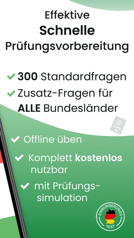 Unsere App enthält alle offiziellen Fragen des Bundesamts für Migration und Flüchtlinge, um die Vorbereitung so optimal wie möglich zu gestalten.