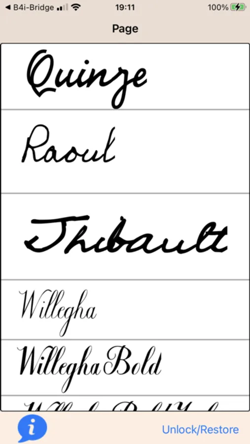If you want, purchase the 12 fonts from inside the app to install on your iPhone or iPad to use with all standard apps that take fonts, like Word, Acrobat PDF Maker, Microsoft Office, Photoshop, for instance…