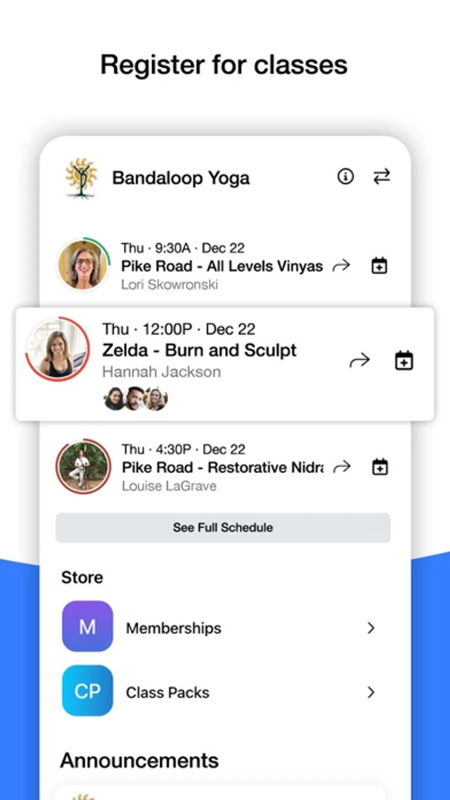 Book your next class on the go. Bandaloop Yoga's app lets you see all of the latest information on class times, and descriptions, instructors and more. Schedule group and, or private classes at the Montgomery, Alabama, and the Pike Road, Alabama locations with ease. Check your account, purchase passes, gift a class to a friend - all right here!