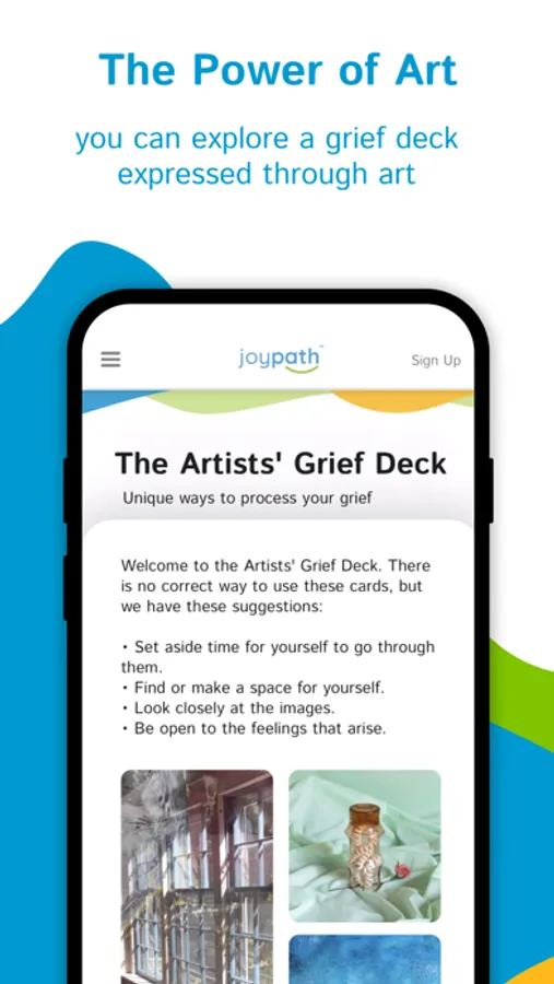JoyPath also incorporates The Artists Grief Deck, a bereavement support tool that displays an original work of art on one side of a grief card and a grief prompt or exercise on the reverse. There are 60 such cards in the deck and JoyPath users can access all and save favorites to their personal collection.
