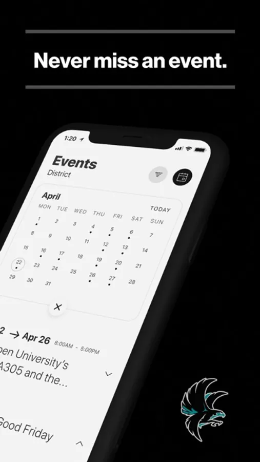 The event section shows a list of events throughout the district. Users can add an event to their calendar to share the event with friends and family with one tap.