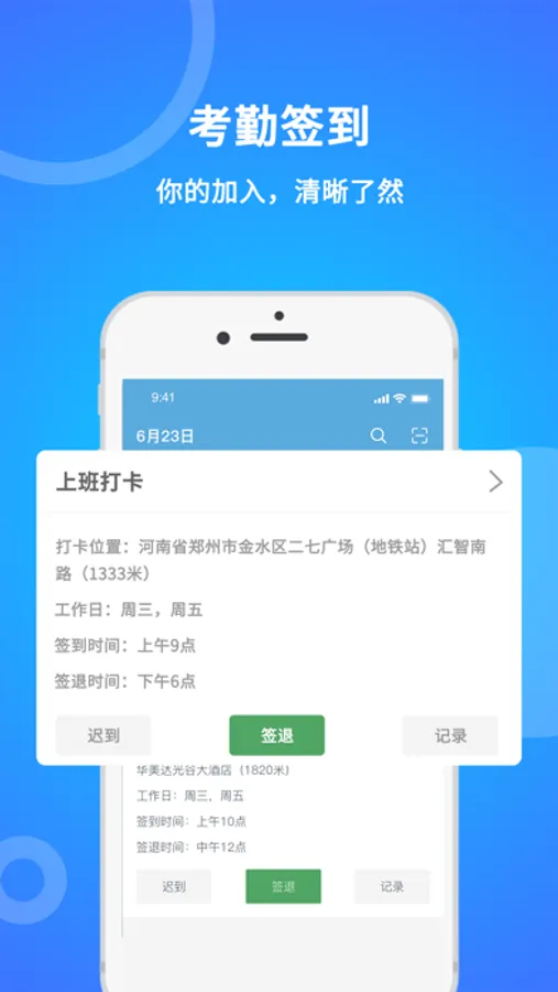 『咚咚考勤』是一个支持定位打卡、WiFi信号打卡、二维码扫描打卡,等多种打卡方式的考勤APP, 它有丰富的考勤类别,如夜班考勤、单双休(大小周)考勤、弹性工作制、每月N休、多办公点分散考勤、 按月排班、出差记录等等,只需要选择一种适合自己企业考勤制度的类别即可。