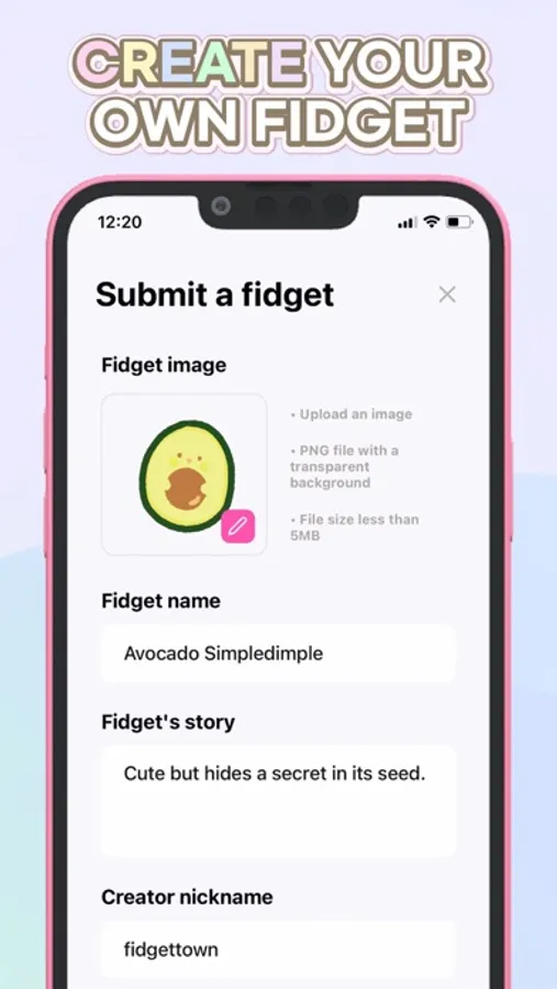 Fidget Town is a home for all kind of fidgets. Create your imaginary fidget and submit it! Selected fidgets will be later added after review. Your fidget can be a rare fidget that everyone wants to own!