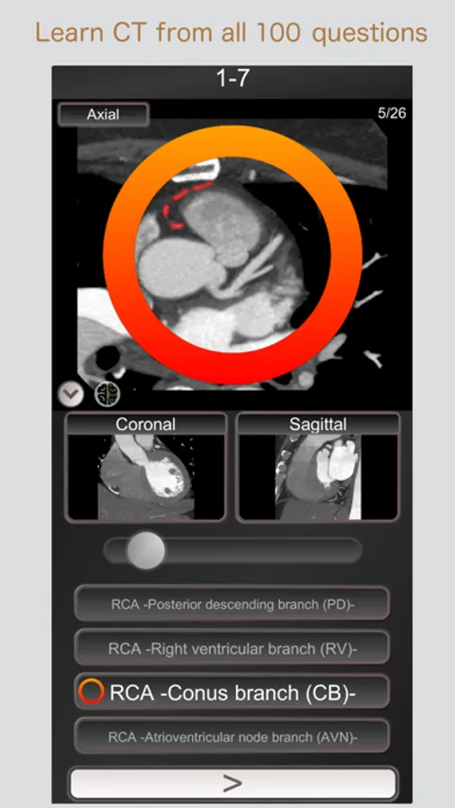 This app asks the anatomy name displayed on the CT image in a quiz format, and you can learn image anatomy efficiently by switching the axial section, coronal section, and sagittal section and selecting the answer from the 4-choice question. increase.