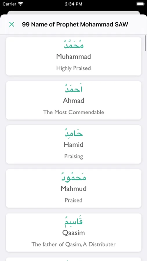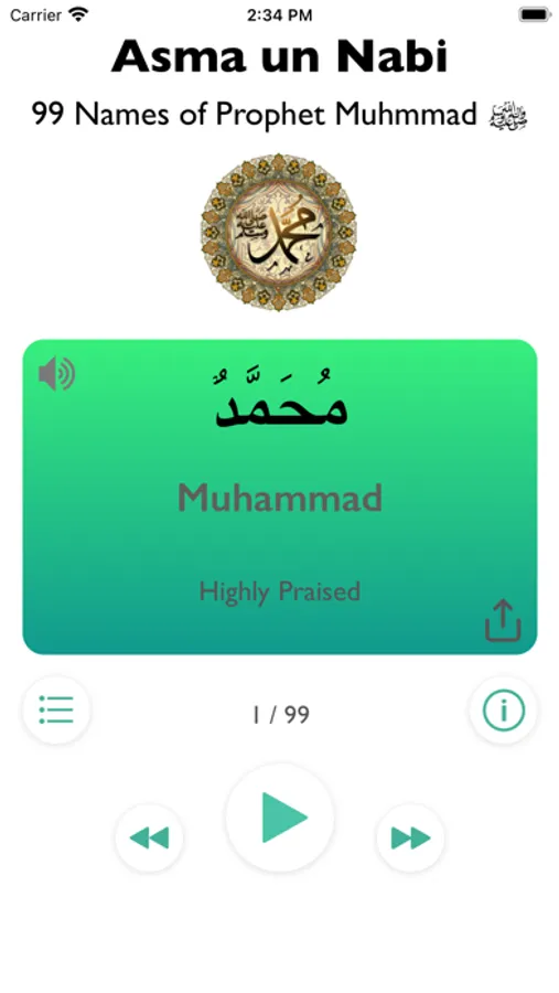Asma un Nabi - 99 names of Prophet Muhammad PBUH with translation and audio recitation.