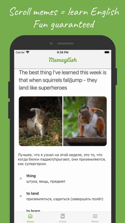These days everybody needs some command of English. But no one likes to be bored! So we created Memeglish for those who are tired of the usual boring textbook experience. Scroll through the meme feed with dozens and even hundreds of those fresh memes in English, check translations and absorb words and grammar effortlessly.