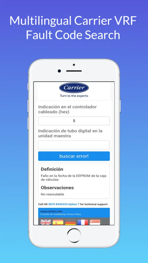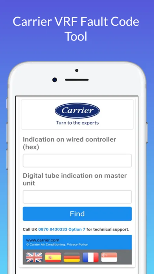 This simple to use App allows you to enter the fault code displayed by your Carrier Air Conditioning unit to assist in diagnosing issues and provide troubleshooting help.