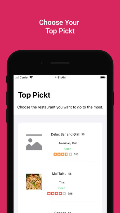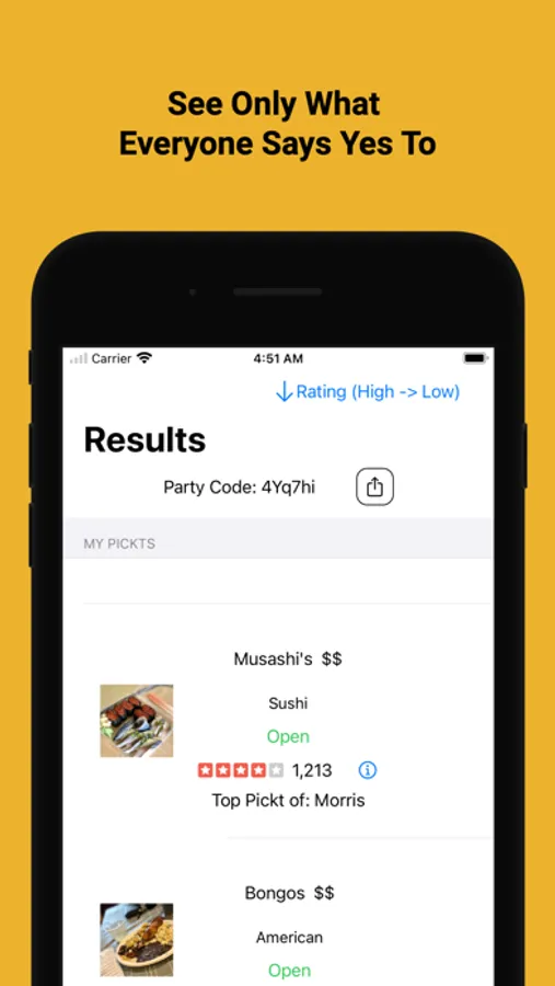 and you're done. Using Pickt's Proprietary algorithm, we are able to display only restaurants that the entire group has said yes to, ranked by top pickt.