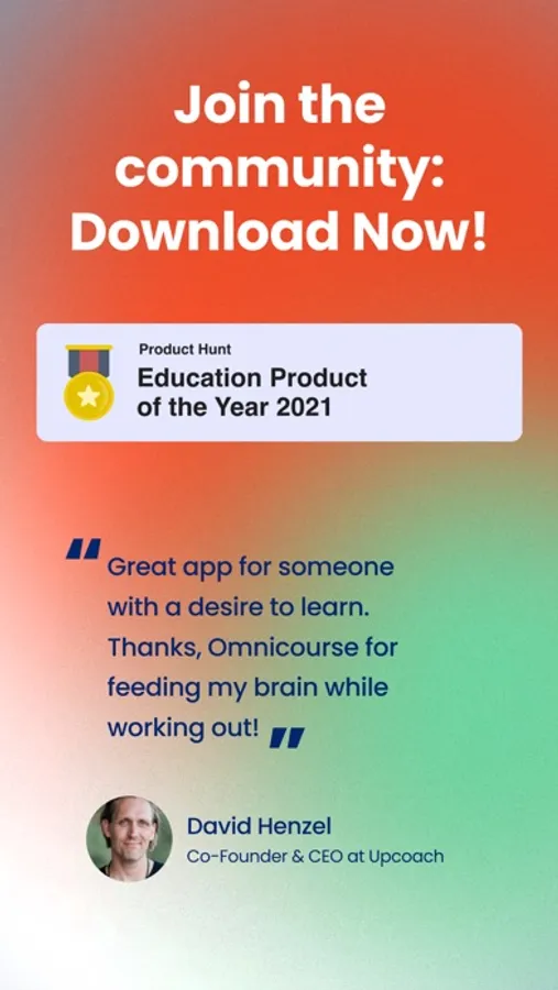 “Omnicourse is a great app for anyone wanting to learn. It feeds my brain while I'm working out!” - David Henzel, Co-Founder & CEO @ Upcoach