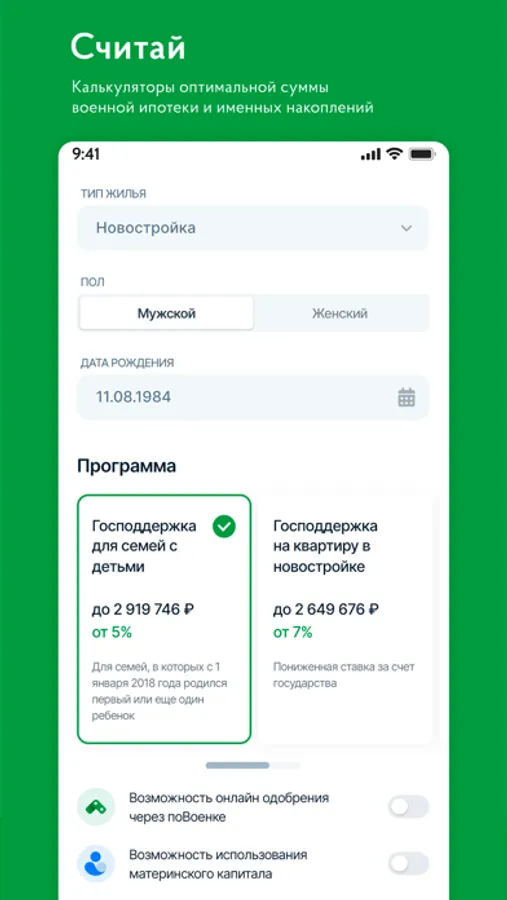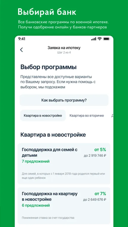 • Указываете подходящую банковскую программу: "Господдержка на покупку у юрлица", "Стандартная", "Господдержка для семей с детьми", "Объединение ипотек супругов";