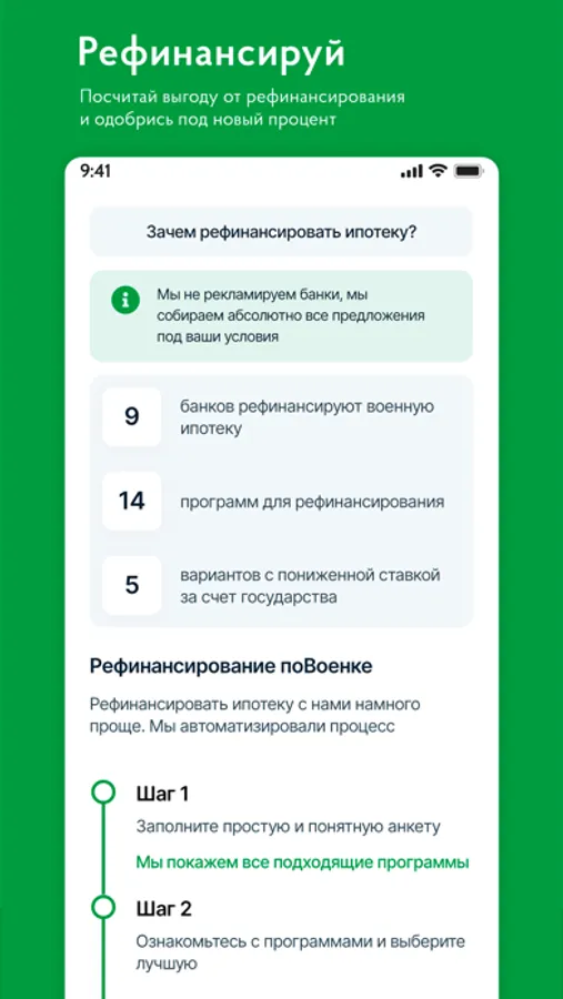 Мы создали удобный сервис для быстрого получения одобрения или запуска процедуры рефинансирования военной ипотеки. Теперь не нужно пересматривать сайты всех банков. В приложении представлены абсолютно все программы, реализуемые по военной ипотеке.