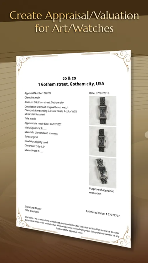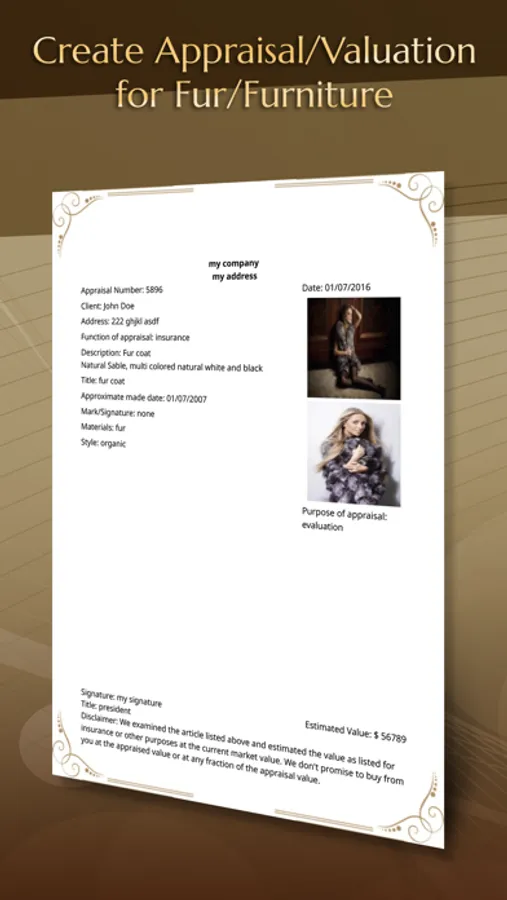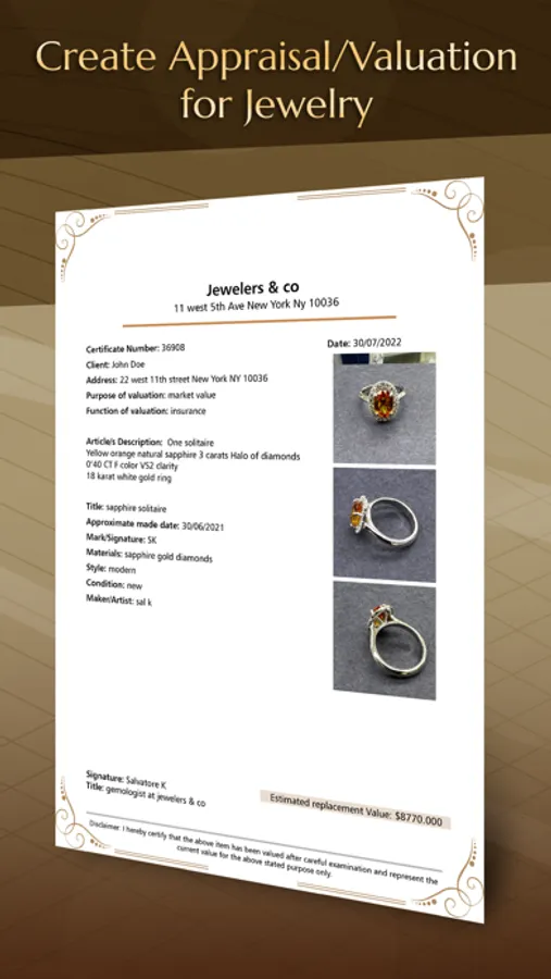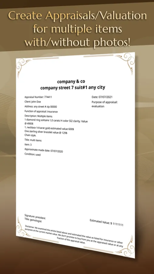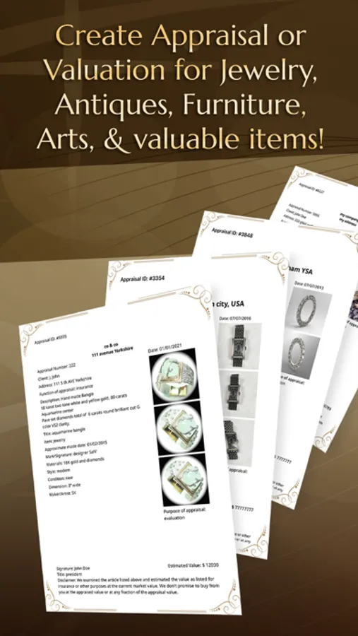 Create your appraisal or valuation PDF certificate in a matter of minutes, add up to 3 photos, you can Appraise/Valuate: Jewelry, Antiques, Arts, Fur, Carpets, Furniture, Crafts, and any valuable items! easy typing, you can also copy and paste description, fast efficient and affordable.