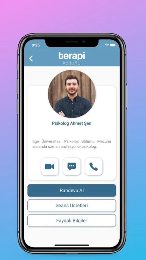 Terapi Koltuğu, psikologlar ve diyetisyenler ile görüntülü görüşme yapabileceğiniz bir mobil uygulamadır. Uzmanların hepsi diploma ve sertifikaları kontrol edilmiş ve mülakatlarla sisteme dahil edilmiş, en az yüksek lisans (master) yapmış uzman kişilerdir. Mobil uygulamayı kullanarak dilediğiniz uzman ile mesajlaşabilir, bir uzmanı seçerek randevu alabilir ve isteğinize göre online olarak görüntülü ya da sesli görüşme gerçekleştirebilirsiniz.
