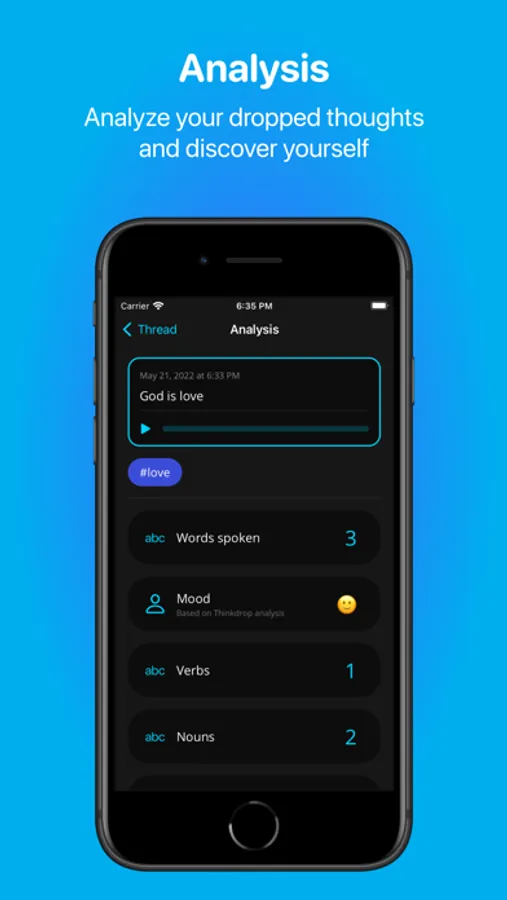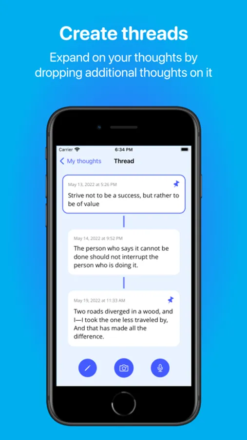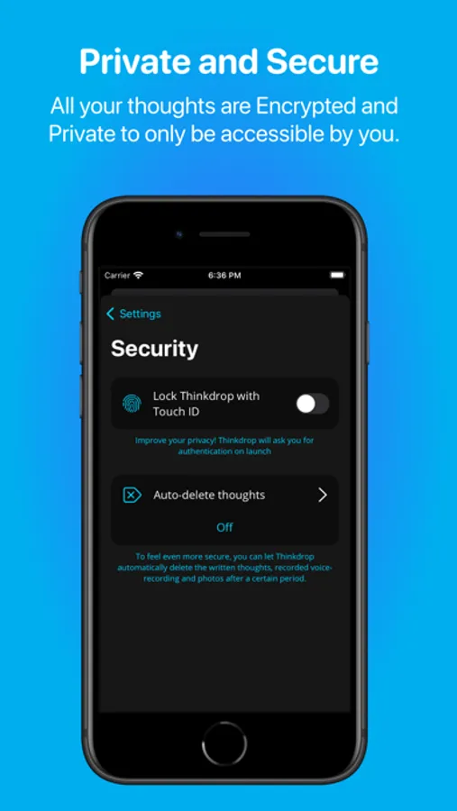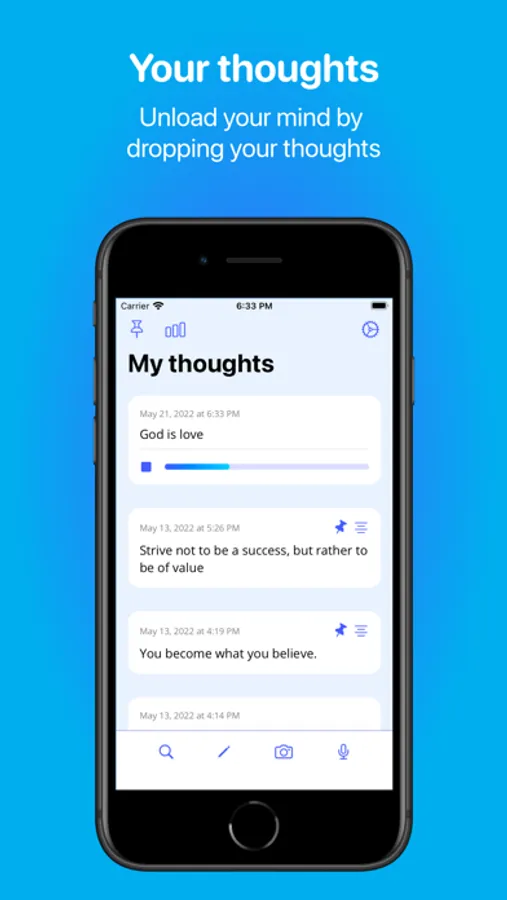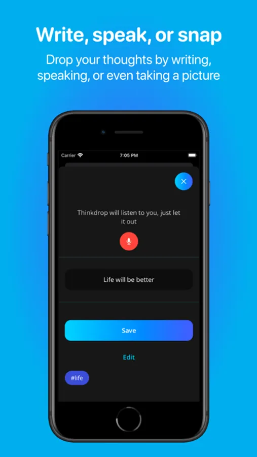 Thinkdrop is made to drop your thoughts fast and private. Have a thought as an idea, compliment, annoyance, concern, accomplishment, or similar? Write, speak, or even snap it down and unload your mind. Thinkdrop then keeps your thoughts encrypted and securely stored locally on your phone or even in your personal iCloud. Thinkdrop thus only accessibly by you like your own mind.