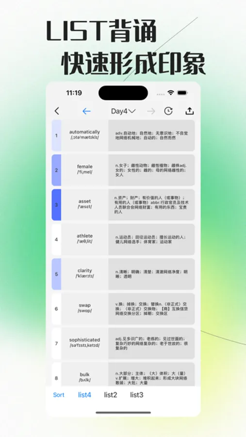 它的独特处在于:拥有列表和单词两种颗粒度防遗忘算法。可以让你轻松记单词,防遗忘。