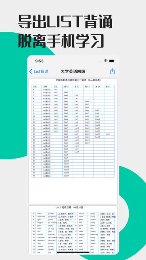 自动生成单词颗粒度和列表颗粒度的艾宾浩斯防遗忘学习表,可一次性导出全部词库,方便用户线下进行纸质学习。