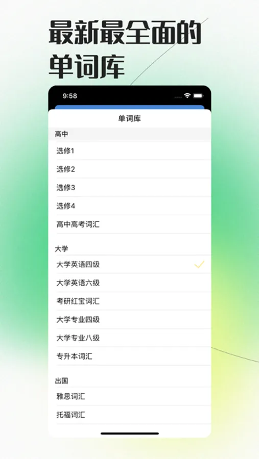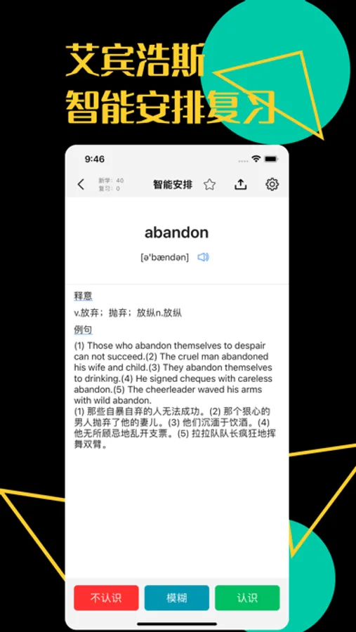 这是一款个性化的运用艾宾浩斯记忆算法原理,根据个人记忆程度自动安排学习和复习的背单词软件。