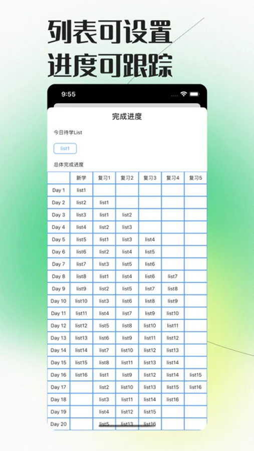 将单词库,分割为若干List,对单词List进行学习和间隔复习。采用打卡的模式,对每日的List 一一学习掌握。用户可调节List单词表的词数,根据自己的学习计划,考试安排来设置最终完成掌握整个单词库的时间。