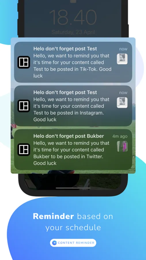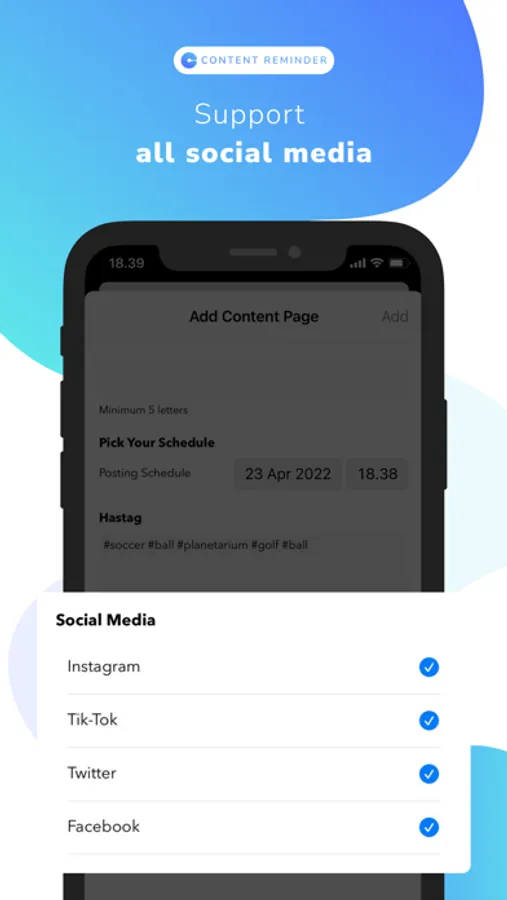 With Content Reminder, you can easily separate schedule sharing on Instagram, Facebook, Twitter, and TikTok so there are no words confused and forgetting to post content.