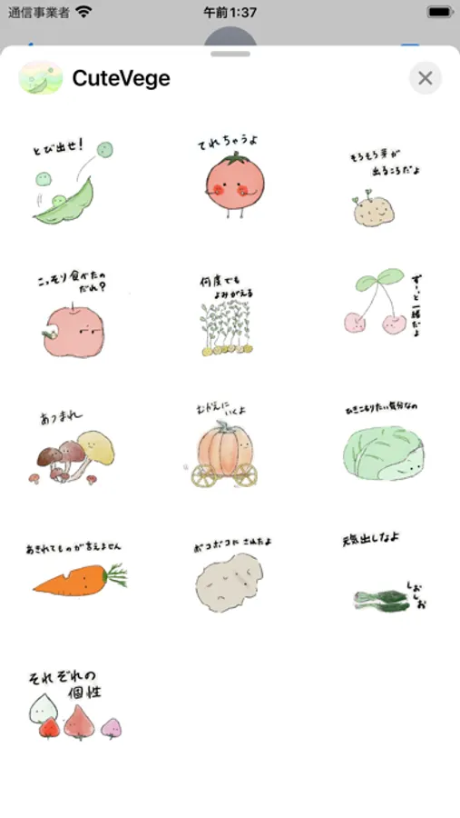 キャベツやニンジン、枝豆などのかわいい野菜・果物たちを送れるiMessage Stickerです。