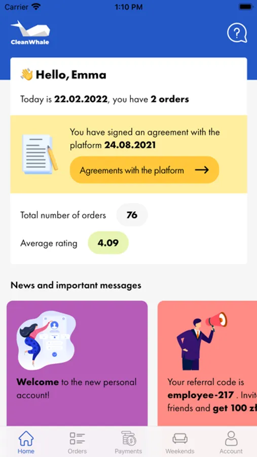 It’s easy to get started on the Cleanwhale platform. Download the app, create an account and wait for verification. After it you can choose the date and time to come to the office and complete registration. When your profile is activated, you see available orders and can take them.