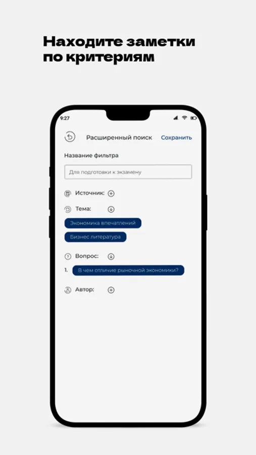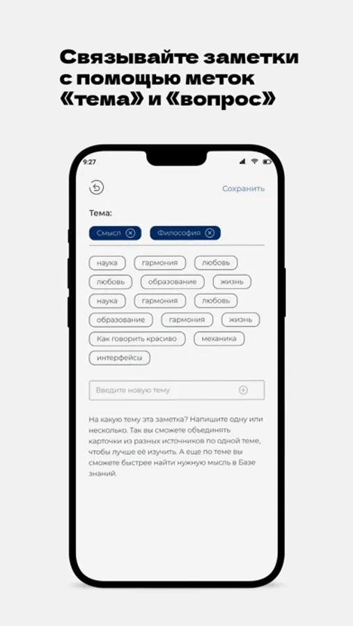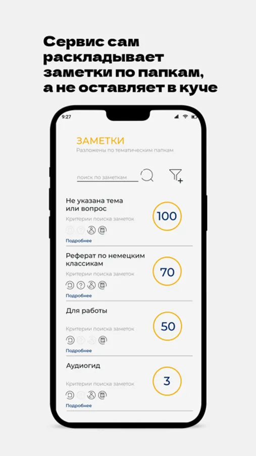Чтобы было удобно пользоваться знаниями, карточки отфильтрованы и представлены в виде выборок. С помощью выборок можно настраивать списки карточек по темам, авторам, источникам и вопросам. Например, вы решили послушать аудиокнигу Максима Ильяхова. Создаёте источник в приложении и называете его "Ясно, понятно". Сервис автоматически создаёт пространство, в которое будет складывать все заметки по аудиокниге. Затем можно зайти в заметку и указать тему «Заголовки». Теперь все заметки с этой темой из любых источников будут отображаться в подборке «Заголовки». Если в карточке с заметкой не проставлена тема или вопрос, то она появляется в соответствующем списке.