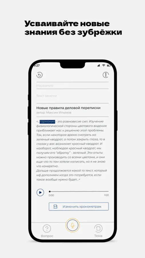 Работает в одно касание. Нажмите кнопку, когда услышали что-то важное - и Graffit сохранит аудиофрагмент, переведёт его в текст и создаст заметку. Вернитесь к заметке позже - увеличьте или сократите сохранённый аудиофрагмент, перечитайте текст, придумайте название, оставьте комментарий и поставьте теги. Так вы хорошо запомните материал и быстро найдёте информацию, когда потребуется.