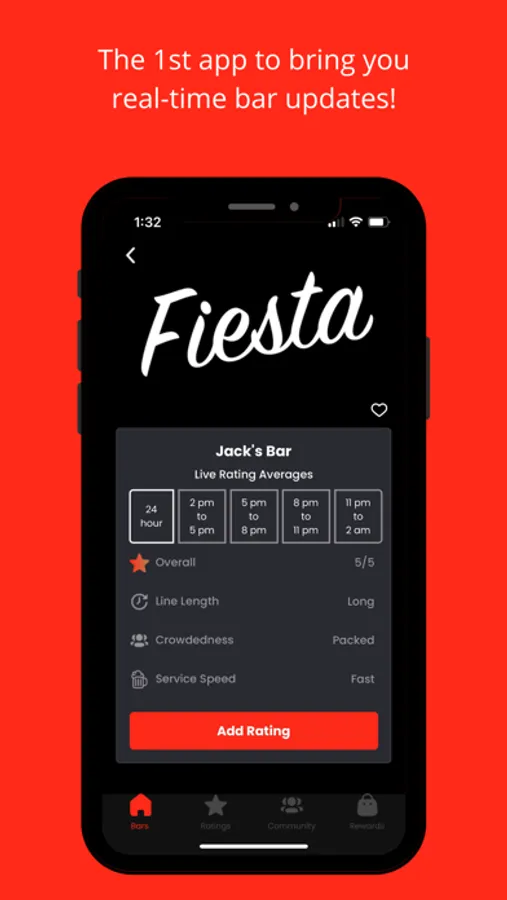 Fiesta aggregates real-time data, through live user ratings, on individual bar line lengths, crowdedness levels, service speeds, and more. With real-time updates, Fiesta takes the guesswork out of finding your perfect nightlife atmosphere.