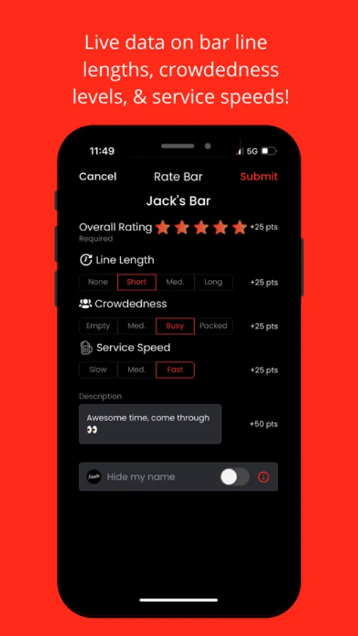 Upon leaving a live bar rating, you’re awarded points. With points, you can redeem exclusive deals at bars and e-commerce brands young adults love (i.e. Happy Hour deals, 10% off codes, etc.)