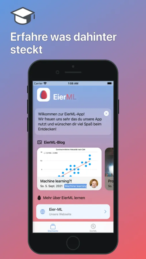 Mit der EierML-App kannst du ganz einfach das für dich perfekte Ei kochen. Gebe dafür nur die Maße deines Eis in die EierML-App ein und wie hart es sein soll und wir berechnen mit Machine learning wie lange dein Ei kochen muss. Probier es einfach aus, die EierML-App ist kostenlos und werbefrei.
