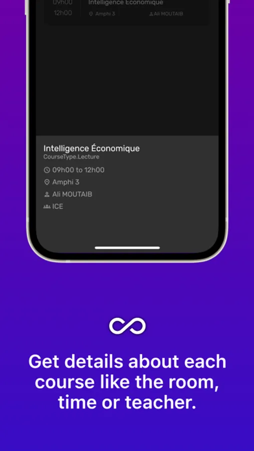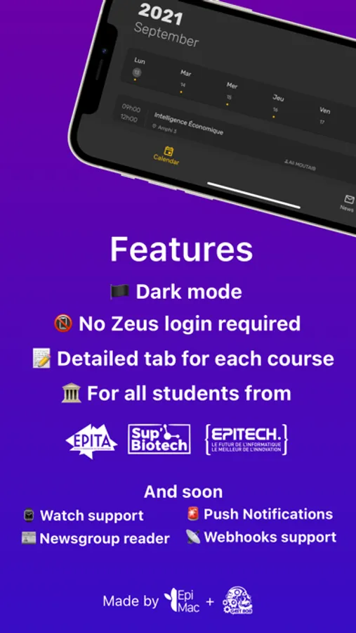 Infinity aims to centralize your platforms during your studies at EPITA, Epitech or Sup’Biotech. You can access to the Zeus schedule and soon read your newsgroups directly from the app.
