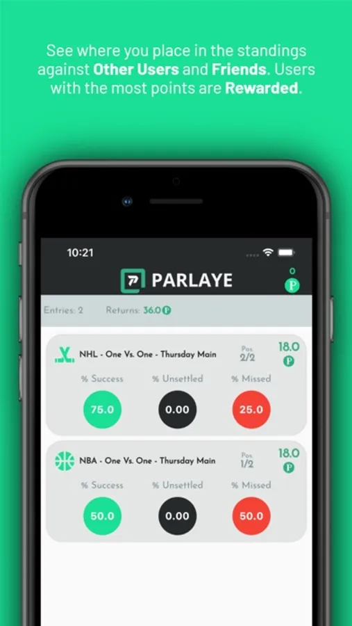 Enter your parlays into competitive contests with friends or other users on the platform without having to wager hard earned cash. Unlike a traditional sportsbook, if one leg of the parlay does not hit, the entire bet is not lost, the multiplier is simply reduced. The user(s) with the highest accumulated points at the end of the competition has the best chance to win!