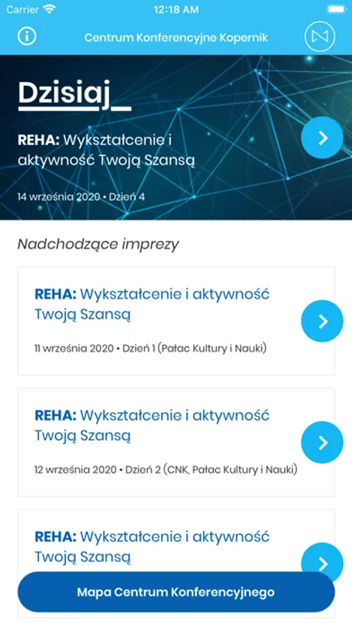 Aplikacja wyświetla informacje ułatwiające poruszanie się po Centrum Nauki Kopernik w oparciu o zainstalowane w budynku beacony.
