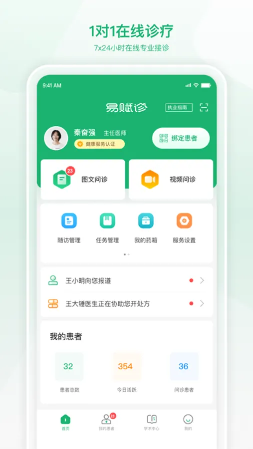 天津易赋诊门诊部定位线上复诊,医患在线沟通,医生为患者开具电子处方,由药师对电子处方进行审核;主要为管理患者基本信息,致力于让患者过上有品质的生活。