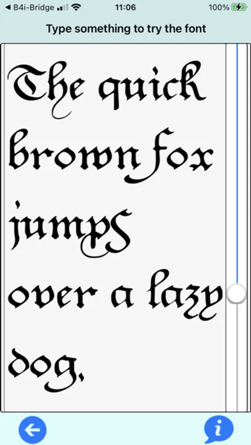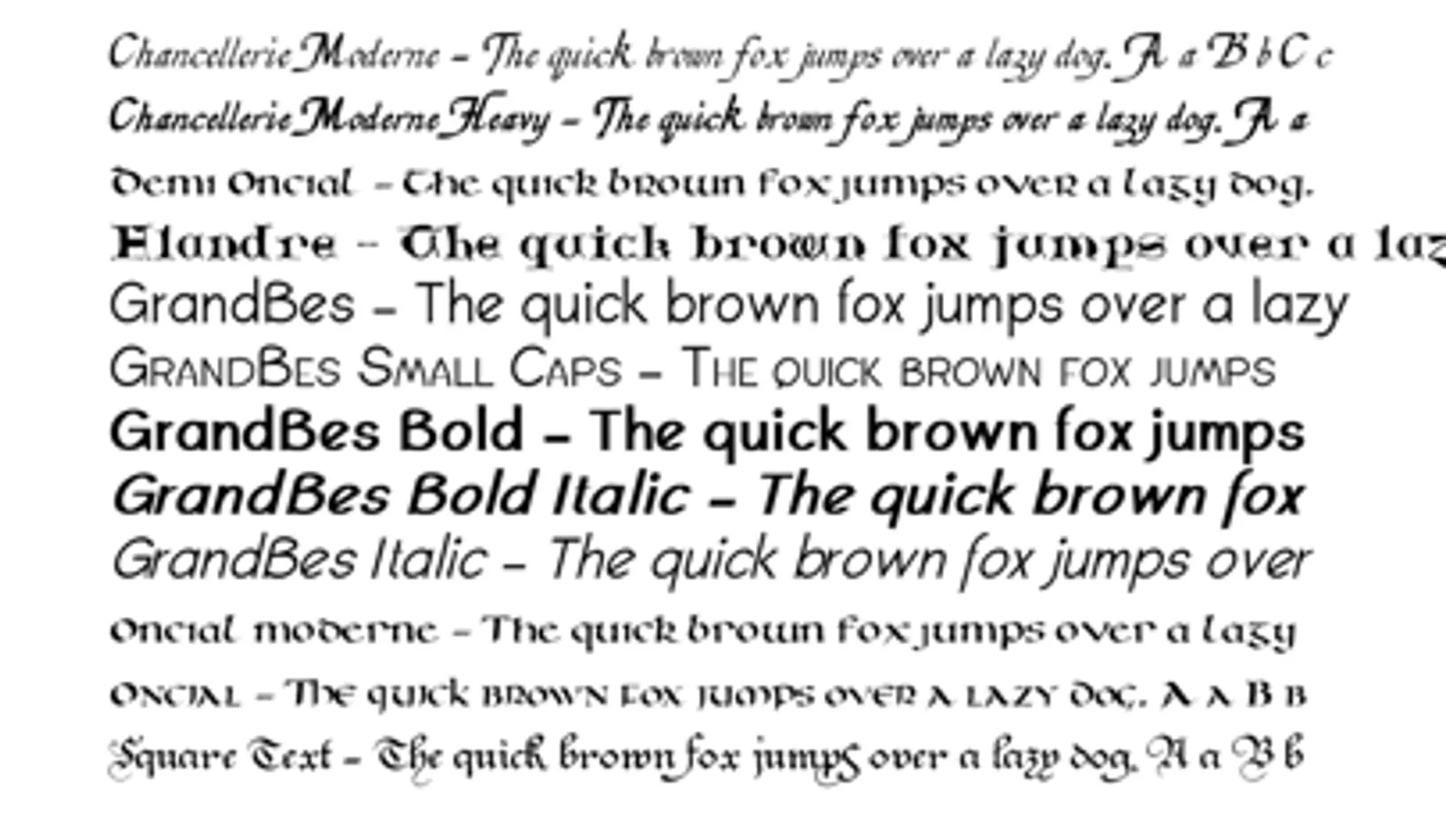 12 calligraphic fonts of all periods, from traditional middle ages Uncial and BlackLetters through Modern Chancery and contemporary GrandBes. View all fonts, and play with each as much as you want. See it at all sizes.